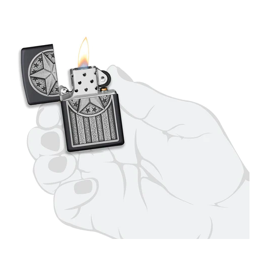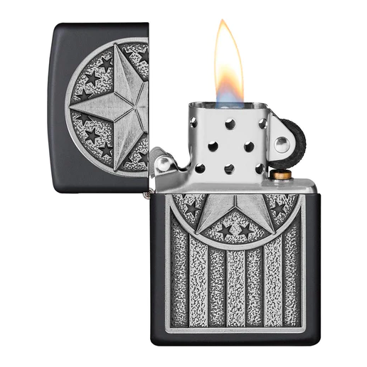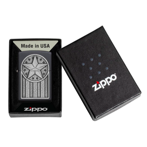 Thể hiện lòng yêu nước của bạn với thiết kế Huy hiệu Kim loại Hoa Kỳ này. Huy hiệu này có thiết kế lấy cảm hứng từ Quốc kỳ Hoa Kỳ. Một ngôi sao lớn được hiển thị ở phần đầu của huy hiệu, với những ngôi sao nhỏ vây quanh. Các sọc ngang treo từ ngôi sao để hoàn thành huy hiệu mạnh mẽ này. Cuối cùng, huy hiệu được gắn tự hào vào một chiếc bật lửa chống gió mờ màu Đen (Black Matte). Được đóng gói trong hộp quà tặng. Để có hiệu suất tối ưu, hãy nạp nhiên liệu bật lửa Zippo.