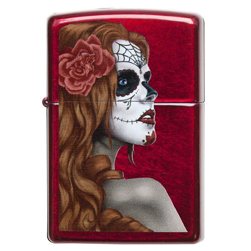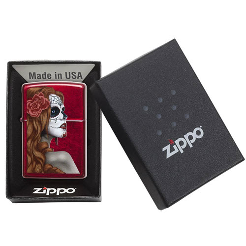 Lấy cảm hứng từ lễ hội Day of the Dead của Mexico, bật lửa màu Đỏ Candy Apple này có một cô gái với một bông hoa hồng trên tóc. Sản phẩm được đóng gói trong hộp quà tặng. Để đạt hiệu suất tốt nhất, hãy nạp nhiên liệu bật lửa Zippo.