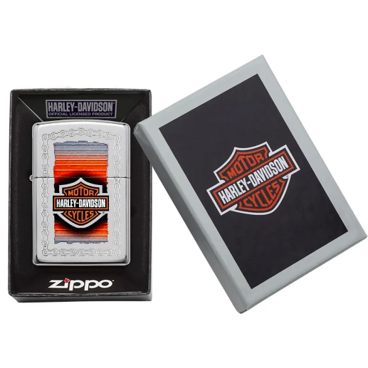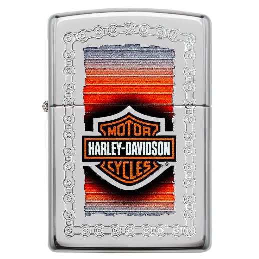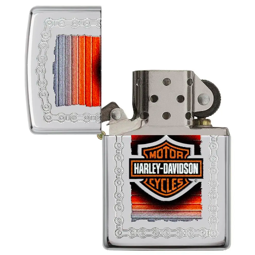 Biểu tượng Harley-Davidson® huyền thoại được in nổi và khắc trang trí trên bề mặt chiếc bật lửa High Polish Chrome.