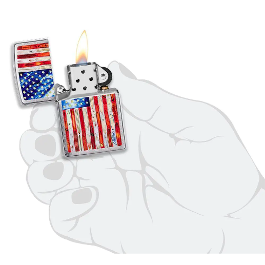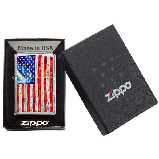 Bật lửa Brushed Chrome có một kĩ thuật chải xước theo phương nằm ngang độc đáo, tạo ra một kết cấu ngang tinh tế ở phía trước và mặt thiết kế Rick Rietveld tạo ra một cái nhìn hiện đại về Cờ Mỹ lịch sử bằng cách đặt ngọn lửa ở vùng Nam California đặc trưng của mình lên nó. Trên lá cờ này, bạn sẽ tìm thấy một làn sóng đặc sắc giữa các ngôi sao và ván lướt sóng chạy dọc các đường sọc của bật lửa. Thiết kế này được hoàn thiện trên mẫu chiếc bật lửa Brushed Chrome.t sau của sản phẩm. Các mặt của bật lửa được đánh bóng đến một kết thúc hoàn hảo nhằm tăng thêm độ tương phản. Mẫu Brushed Chrome được tạo ra vào năm 1933 và vẫn duy trì là mẫu bật lửa phổ biến nhất của Zippo.