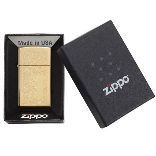 Tất cả các bật lửa Venetian® đều được trang trí trên mặt trước và mặt sau. Bật lửa Slim® mạ bóng cao cấp này bao gồm một bảng mặt trước và có một thiết kế hoa văn. Sản phẩm được đóng gói trong hộp quà tặng. Để đạt hiệu suất tối ưu, hãy nạp nhiên liệu bật lửa Zippo.