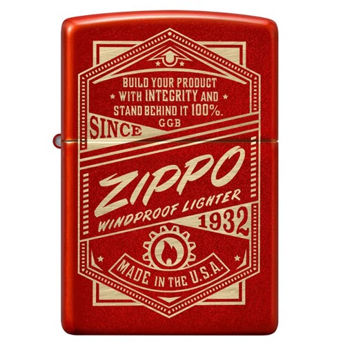 Lấy cảm hứng từ quảng cáo cổ điển, bật lửa Metallic Red này được khắc bằng laser với một trong những biểu tượng ban đầu của Zippo dưới câu nguyên tắc của người sáng lập chúng tôi: "Xây dựng sản phẩm của bạn với tính trung thực và luôn ủng hộ nó 100%." Được đóng gói trong hộp quà tặng. Để đạt hiệu suất tối ưu, hãy nạp nhiên liệu bật lửa Zippo.
