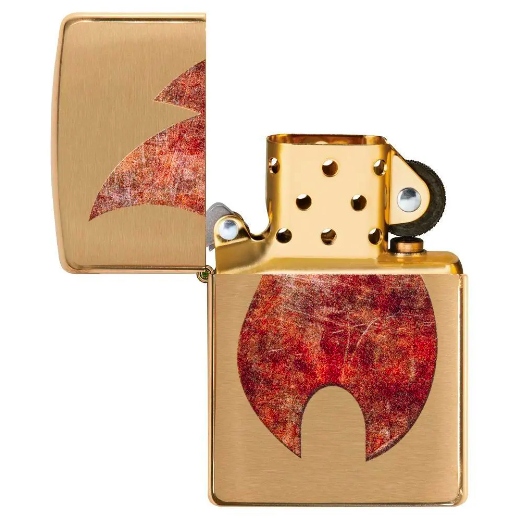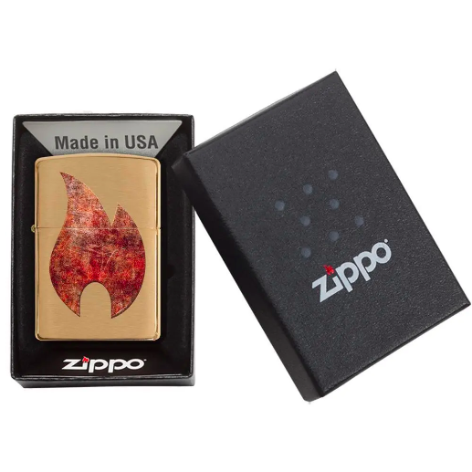 Chất liệu vỏ đồng thau, nền mạ Brushed brass và thiết kế in ngọn lửa Zippo bằng phương hấp nhiệt biền bỉ với thời gian.