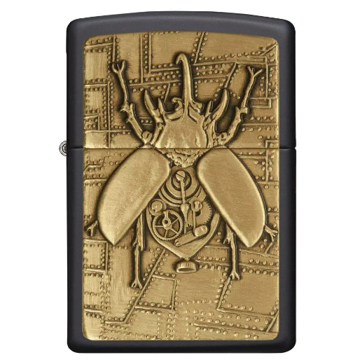 “Tick-Tick-Click!” Lắng nghe âm thanh ồn ào của chú bọ cánh cứng chạy bằng hơi nước đầy phức tạp này trong lúc nó nằm để lộ những bánh răng và tiện ích bên trong nó. Toàn bộ biểu tượng được đúc bằng đồng thau và gắn trên mẫu matte màu đen cổ điển.