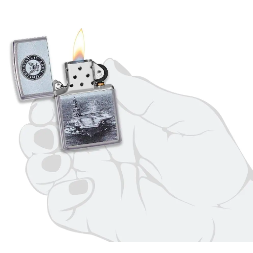 Bật lửa Zippo đồng thau, nền mạ Street Chrome ™ này được thiết kế in hình màu để bao gồm logo của Hải quân Hoa Kỳ ® trên nắp với một tàu sân bay bên dưới.