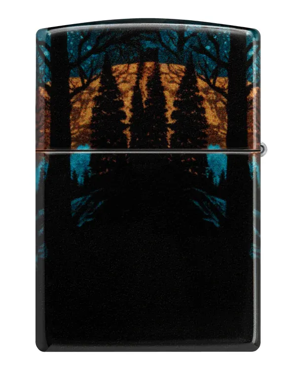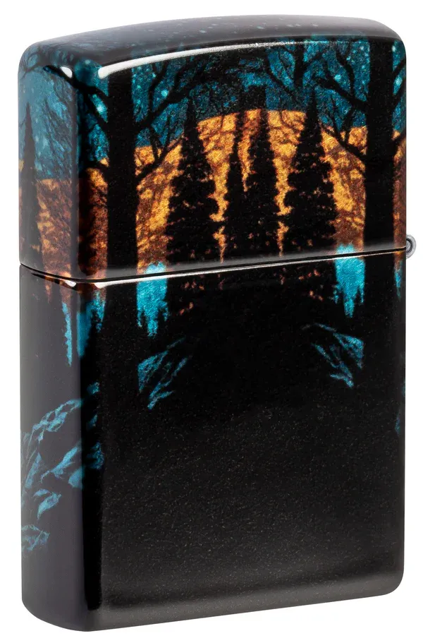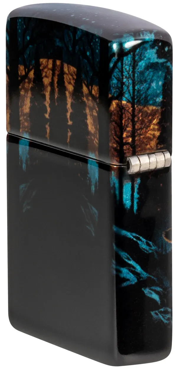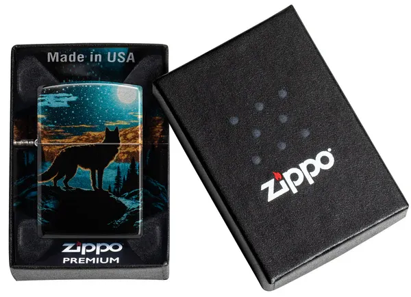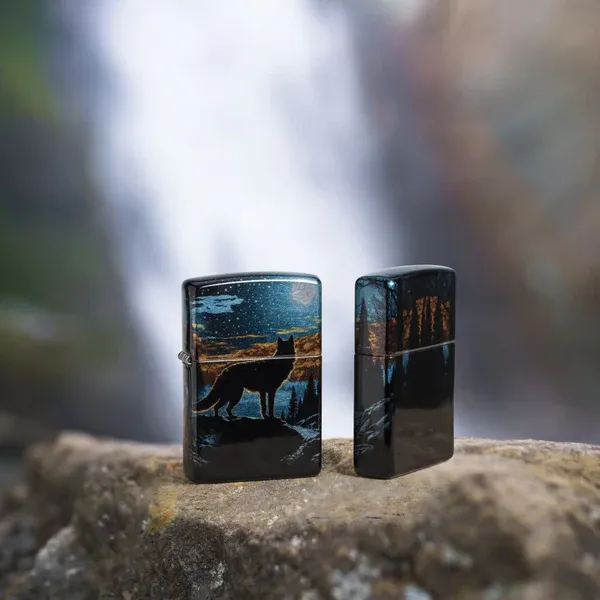 Một con sói đơn độc nhìn chằm chằm vào quang cảnh dưới ánh trăng trên chiếc bật lửa Tumbled Chrome cổ điển này với thiết kế 540 Fusion rực rỡ