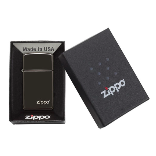 Bật lửa Slim® này gần như tối đen như đêm. Bật lửa Slim® mạ chrome này có biểu tượng Zippo được liên kết với một lớp phủ siêu mỏng chống trầy để đạt được màu High Polish Black, một lớp hoàn thiện màu đen sáng, sâu và giống như gương. Bật lửa này cũng có sẵn trong một hộp cổ điển. Được đóng gói trong hộp quà tặng. Để đạt hiệu suất tối ưu, hãy sạc bằng nhiên liệu bật lửa Zippo.